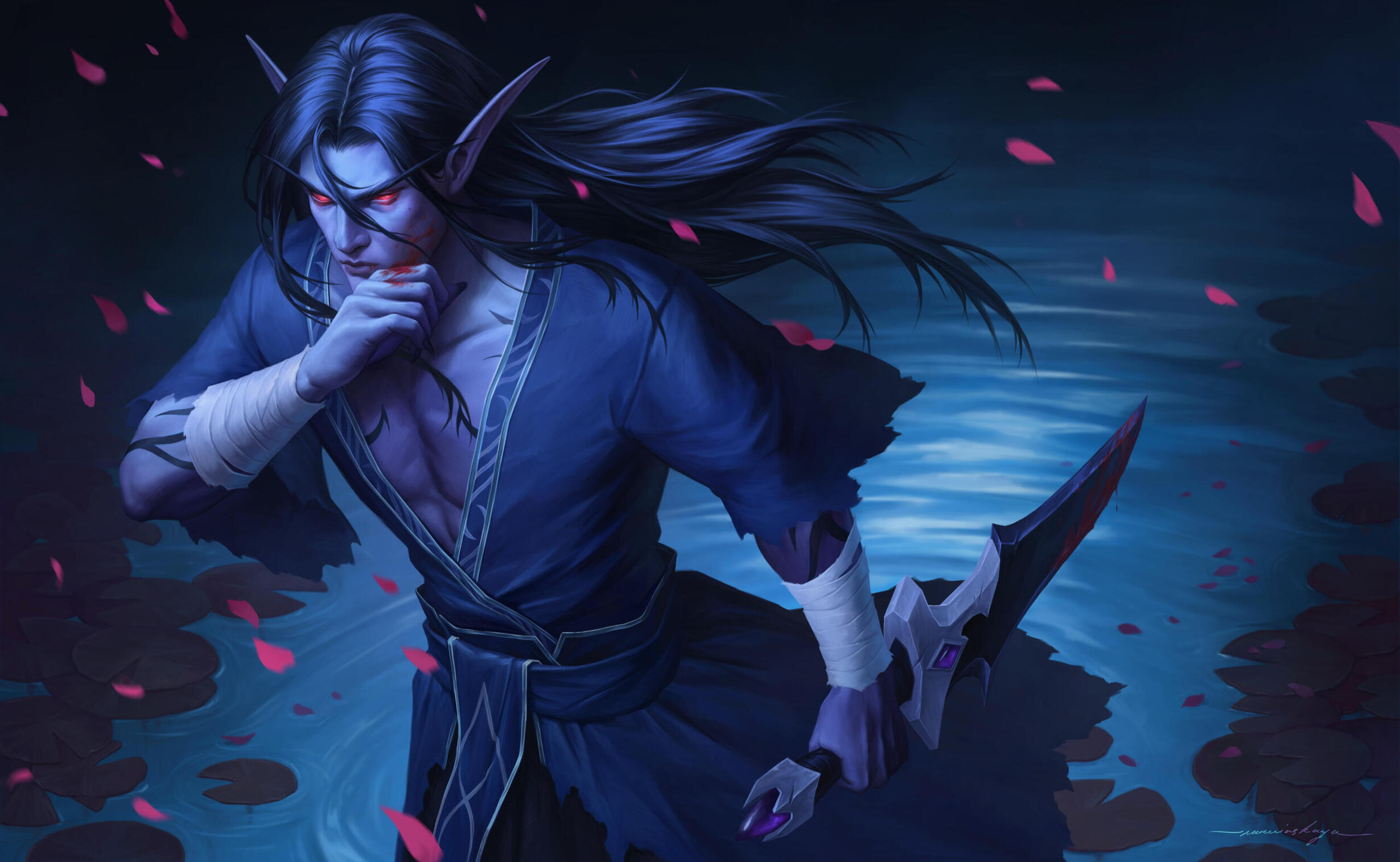 Everything had led up to this moment, and when he thought he’d reach the end, Maralon told him a simple truth, one buried deep through this journey. “You’ve grown strong, strong enough to shape your own destiny. Though I can see it, there is uncertainty and doubt in your heart. If you take this next step without purging it, you’ll die. Return to me when it no longer burdens you, and if that day never comes… hunt well.” It was with that final proclamation from his Shan’do that Sulfar was free for the first time in what felt like an age. Stepping out of the long shadow cast by his master and into Alissera’s village, she was quick to offer him sanctuary. For a time he once more found solace, the simple toil of each day passing by, living amongst her people as a year or perhaps more disappeared. And maybe, if it wasn’t for the Wardens, he’d never have found the path again. It was under the cover of night they came, glaives in hand and the hunt in their eyes. The Kaldorei Wardens cut down the Highborne before they realised they were under attack. Fires roared as screams echoed throughout the village.Sulfar fought with all the skill he could muster, and even then he was no match for the Wardens, forced to flee with those few survivors. He and Alissera led them far from the ruins of the village.Broken, bloodied, and with so many dead, it would be an age before her clan recovered. If he was stronger, if he had ascended, he could have stopped this. And yet once again he fled from those greater than him. Coward. Weakling. All these thoughts and more spiralled through his mind. As Alissera led her people to safety, Sulfar disappeared. In search of the Demon Hunter he swore he would never be so powerless that he could not protect what he cherished. Returning, Maralon could see the answer written all over the bloodied youth, and soon the ritual of ascension began. This forbidden rite was no gift, it was a curse, torment incarnate, and only through such suffering could he evolve to become something more. With his soul pierced by demonic essence, his flesh remade in their image, and his mind twisted by their corruption, his consciousness fractured. It was in that rite he saw everything; each moment of his life, the condemnation for his birth, the shame he brought to his kin, the fall of Black Rook, the truth of Eldre’thalas, and the Wardens cutting down the innocent. It was every choice, every failure laid out before him in a tapestry of his existence, and the demon sought to exploit it. But the past didn’t weaken his will. No it galvanised it into something unbreakable, and so the fiend’s ego was shattered and he became one with the demon.When the torment of the rite drew to an end his once-azure eyes burned with a crimson intensity, his body marked with tattoos and his soul forever scarred by this metamorphosis. It took him some time to recover, and in the centuries that followed he learned to wield this new power. This magic which coursed through his veins would be his salvation. Yet the world did not stand still. Valodriel whispered of the building chaos within Eldre’thalas, and Alissera had separated herself from the clan, chasing power of her own through a mentor whose origins were at the time veiled in secrets. Sulfar roamed far with his Shan’do, across Kalimdor and to distant shores, and by the end of this millennium Sulfar had finally become a Demon Hunter. A familial bond had formed between Maralon and Sulfar, not dissimilar to that between a father and son. It was a quiet thing, something neither of the Hunters would speak on for eons to come. After all the toil was done, Sulfar left, roaming the world for time, learning and hunting monsters. It was on these adventures that his path became clear; this power, he would use it to let the helpless of this world decide their own destiny. The question was, would these noble ambitions truly stand the test of time, as the shadow of Eldre’thalas grew ever darker? He rose sightless, seeing more clearly than ever.